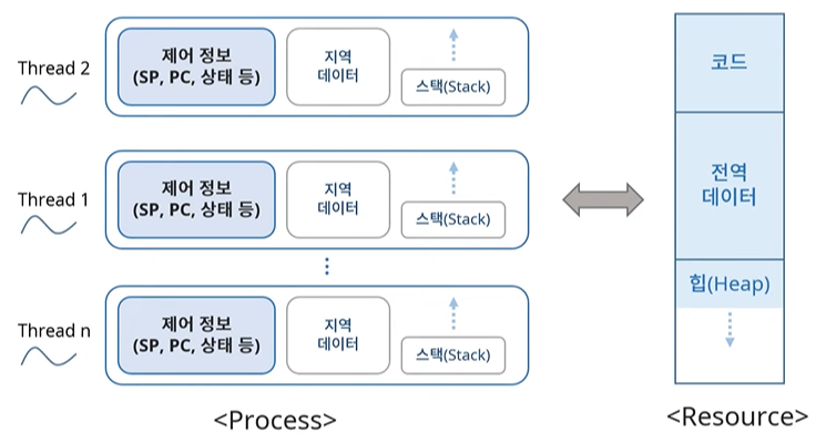 - 스레드는 프로세스와 다르게 하나의 자원을 여러 스레드가 공유 가능