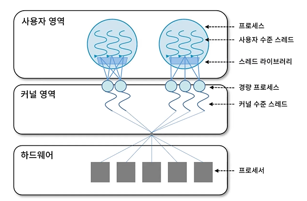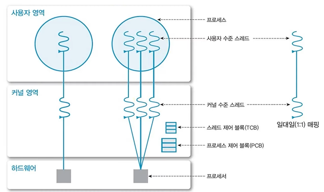 - 커널 영역에서 스레드의 생성과 관리 수행