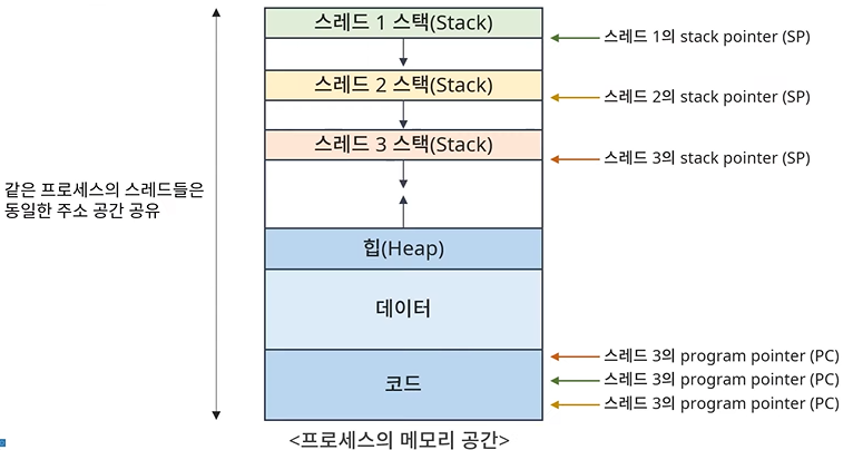 - 하나의 프로세스에 여러 개의 스레드 존재 가능