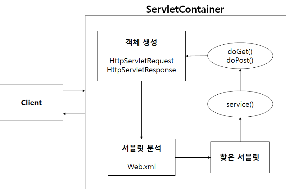 - 서블릿 클래스를 로딩하여 인스턴스화 후 초기화 및 요청이 들어오면 적절한 서블릿 메소드 호출