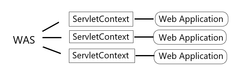 - (아래 그림 참고) 서블릿 컨테이너가 시작될 때, 웹 서버에 등록된 웹 애플리케이션 단위로 하나의 ServletContext객체가 자동으로 생성, 웹 애플리케이션 서비스가 중지될 때 소멸